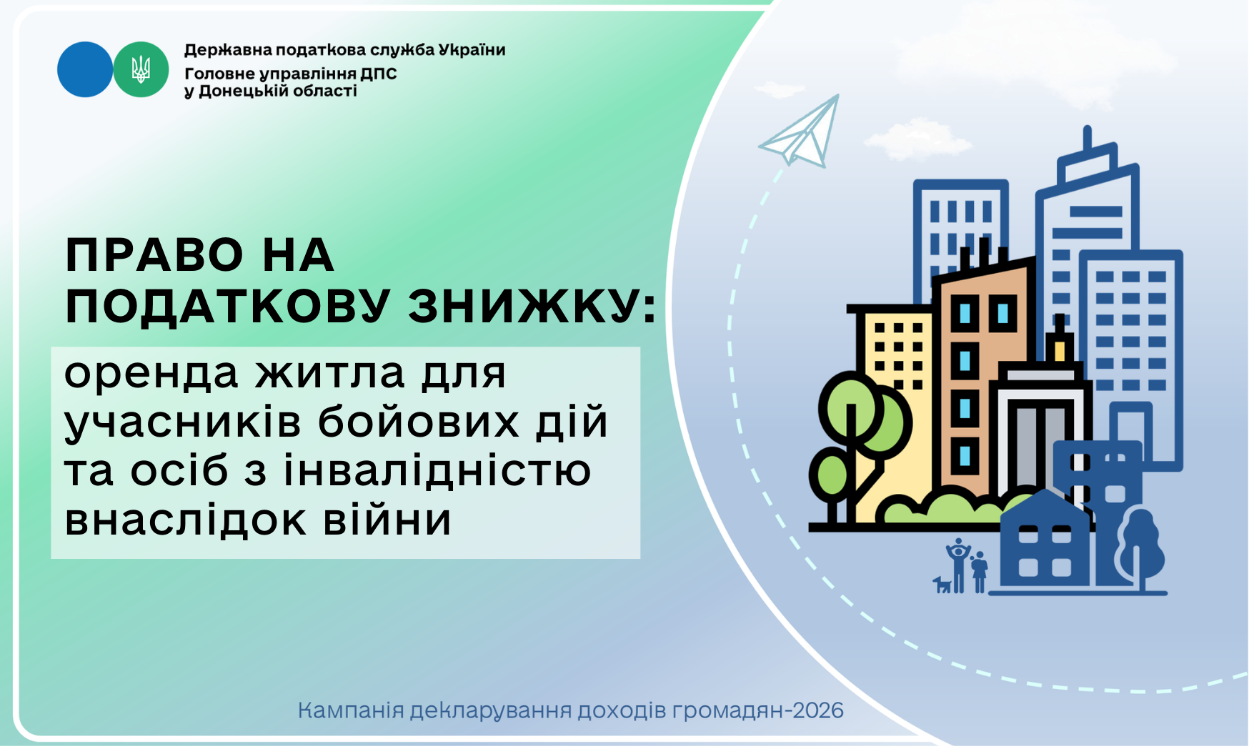 Шановні платники! Головне управління ДПС у Донецькій області інформує, що з 1 січня 20026 року Законом України від 16 липня 2025 року  № 4536-ІХ внесено зміни до Податкового кодексу України в частині розширення кола платників податку, які мають право на податкову знижку за витратами на оренду житла.