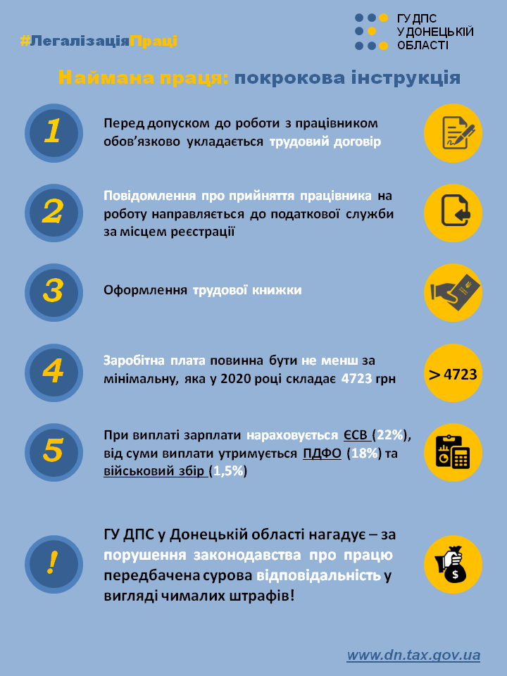 На виконання доручення прем’єр-міністра України Олексія Гончарука від 22 січня 2020 року податкова служба Донеччини разом з фахівцями Головного управління Держпраці у Донецькій області на місцях розпочала вживати рішучі заходи з проведення роз’яснювальної роботи із суб’єктами господарювання щодо неприпустимості допуску до роботи працівників без оформлення трудових відносин, що надасть можливість підвищити соціальний захист громадян та спрямувати кошти на розвиток регіону.