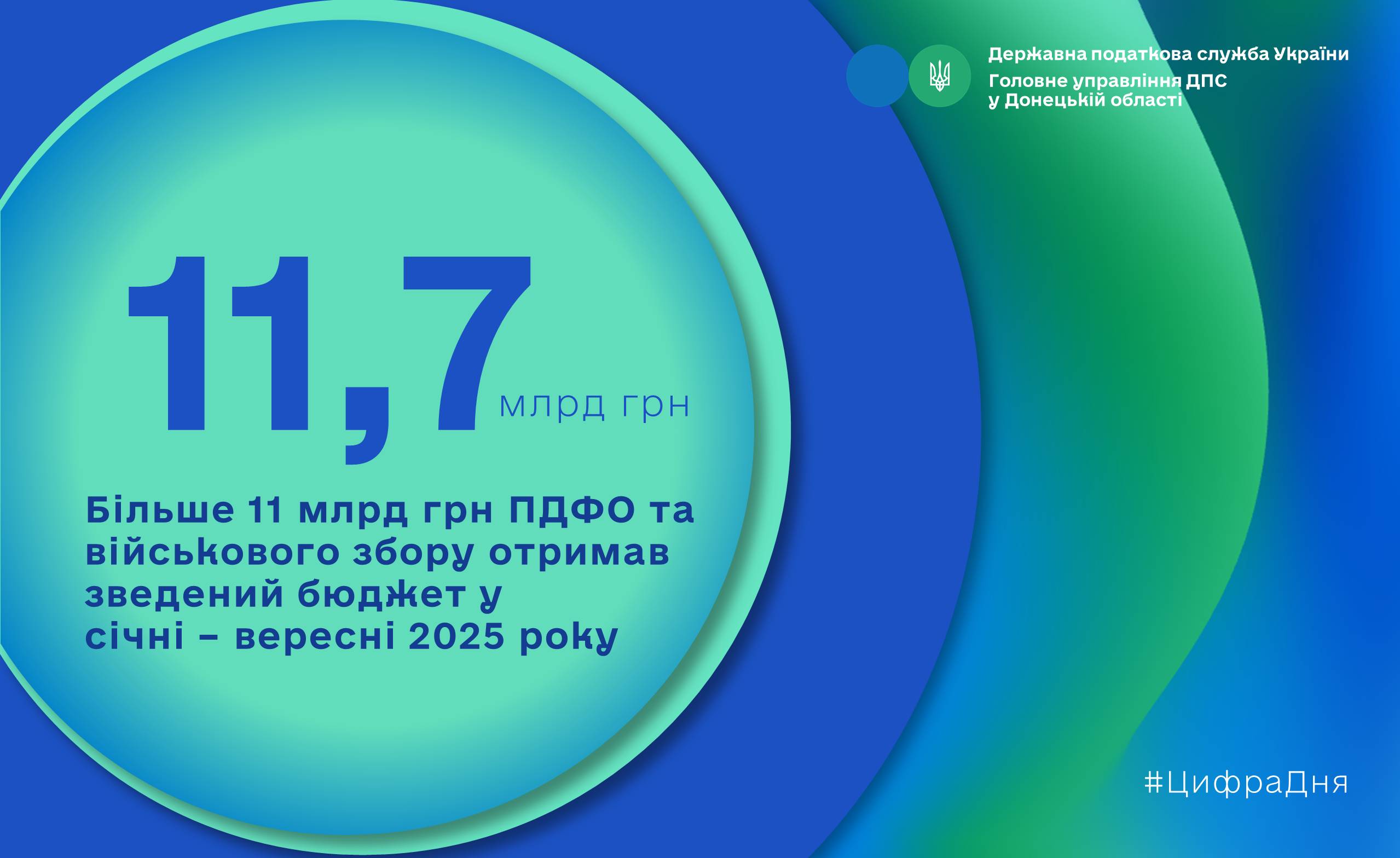 Протягом січня - вересня 2025 року зведений бюджет отримав від платників податків Донецького регіону 11,7 млрд грн податку та збору на доходи фізичних осіб.