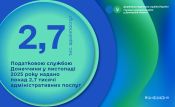 У листопаді 2025 року до податкових органів Донеччини за отриманням адміністративних послуг звернулось 2 895 платників податків. Суб'єктам звернень надано 2 743 адміністративні послуги, з них в електронному вигляді – 1 583 послуги, що становить 57,7% від наданих послуг. Відмовлено у наданні адміністративних послуг 87 заявникам у зв'язку з невиконанням відповідних умов для їх отримання.