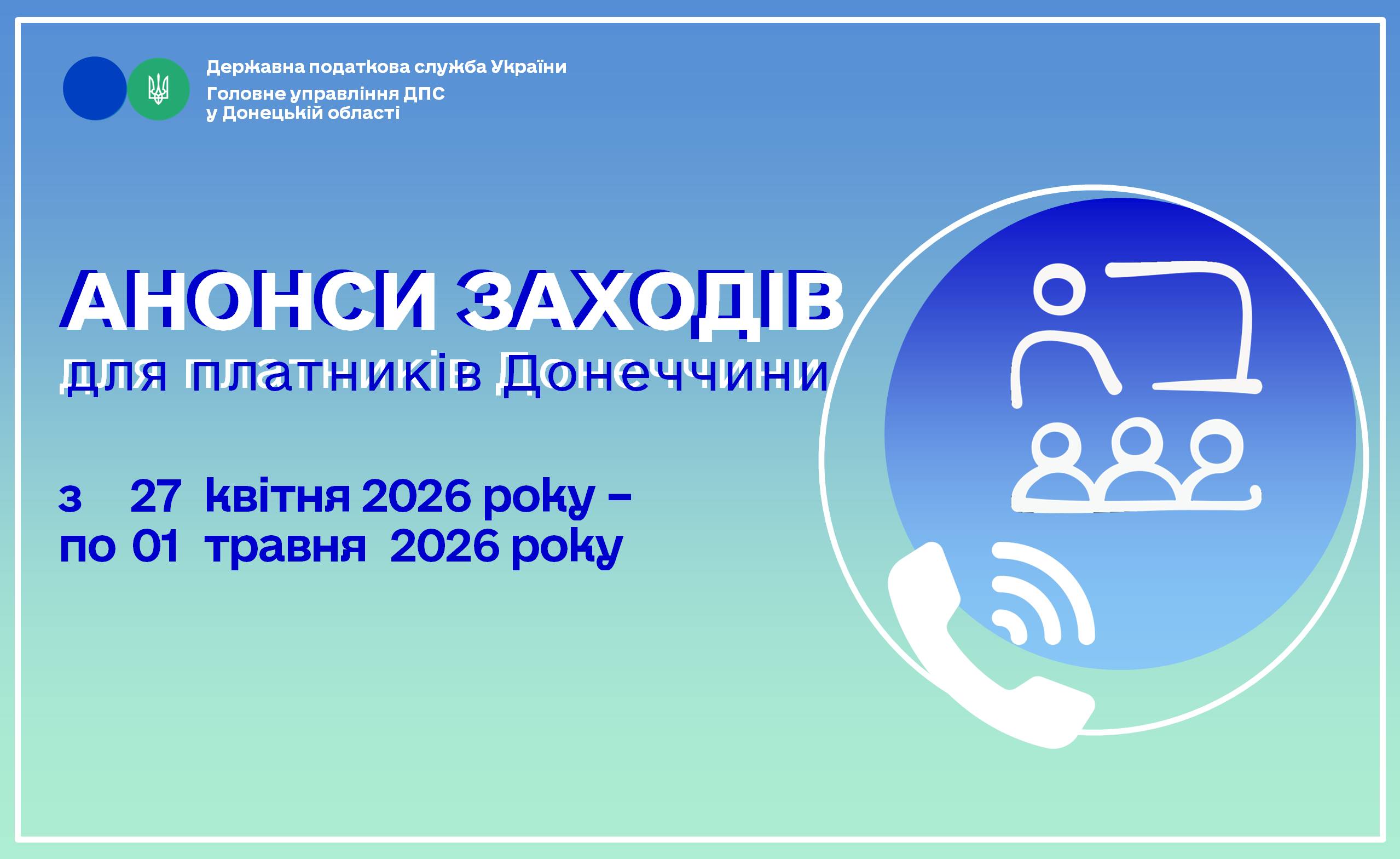 - 29 квітня 2026 року Волноваська ДПІ Головного управління ДПС у Донецькій області запрошує платників Донеччини взяти участь в 11:00 год. в спільному офлайн – заході з Центром підтримки внутрішньо переміщених осіб (ВПО) Волноваського району «Пліч-о-пліч» на тему: «Податкова поруч: які адміністративні послуги можуть отримати громадяни та бізнес».