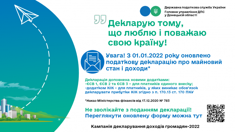 Шановні платники! Головне управління ДПС у Донецькій області нагадує, що з 01 січня 2022 року стартувала кампанія декларування доходів громадян одержаних на протязі 2021 року.