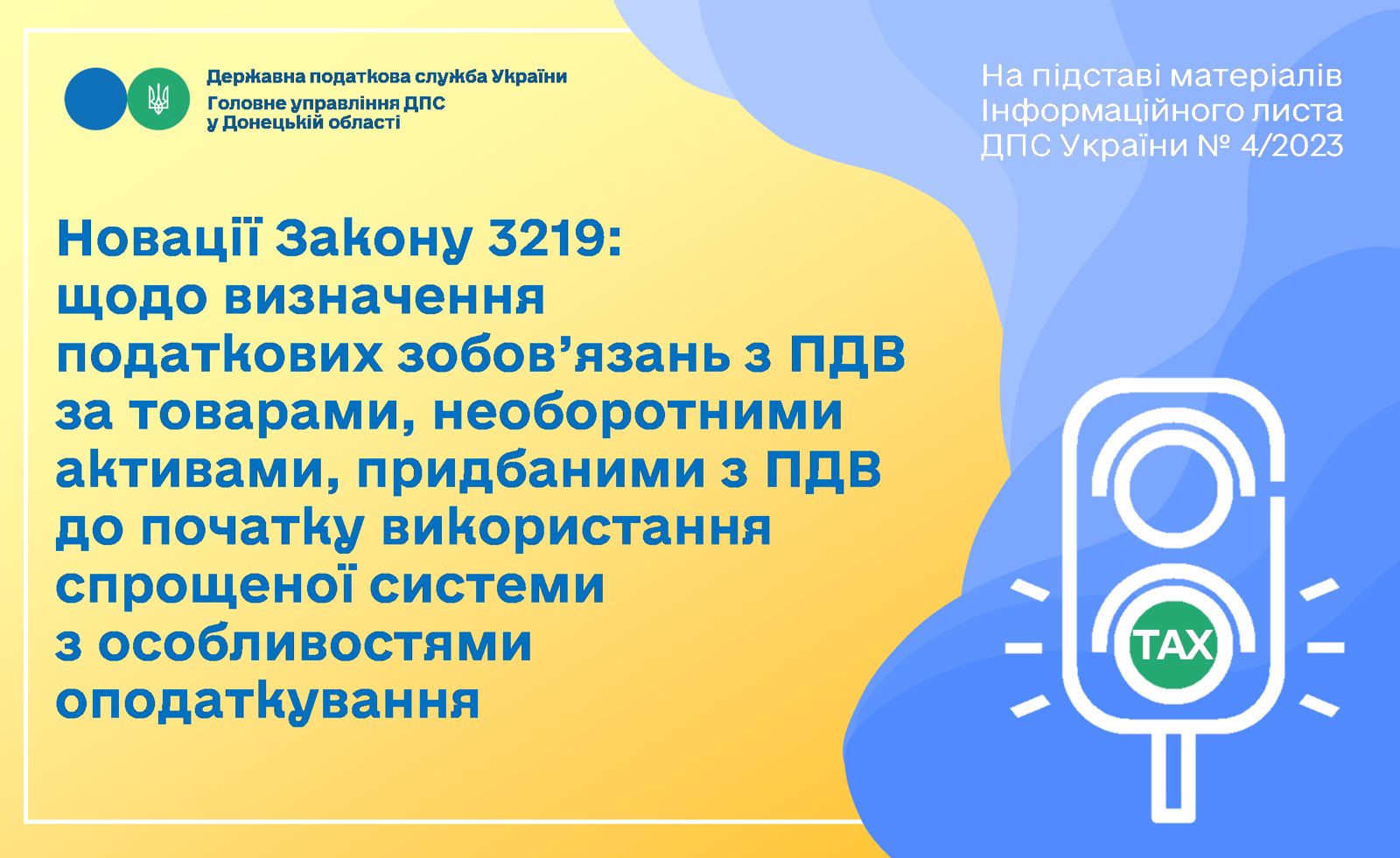 Шановні платники! Головне управління ДПС у Донецькій області продовжує серію інформаційних роз’яснень найактуальніших питань для платників податків згідно з Законом України від 30 червня 2023 року №3219-ІХ «Про внесення змін до податкового кодексу України та інших законів України щодо особливостей оподаткування у період дії воєнного стану» ( далі – Закон № 3219).