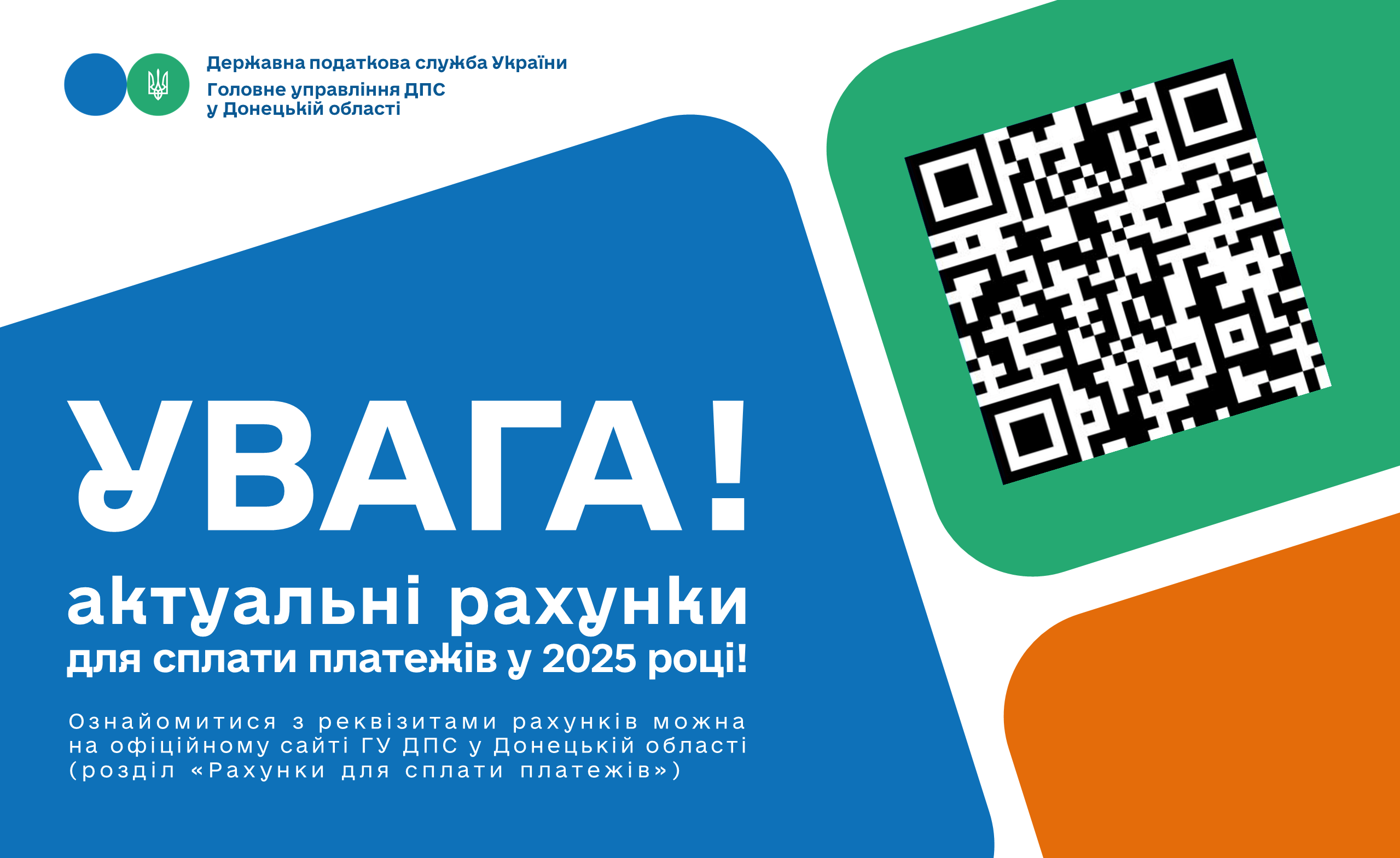 Шановні платники! Головне управління ГУ ДПС у Донецькій області нагадує, що реквізити рахунків для сплати податків, зборів та платежів, відкритих Державною казначейською службою України розміщуються у Центрах обслуговування платників податків, на субсайтах Головних управлінь ДПС в областях та на офіційному вебпорталі ДПС України за посиланням: Головна/Рахунки для сплати платежів (https://tax.gov.ua/rahunki-dlya-splati-platejiv/ ).