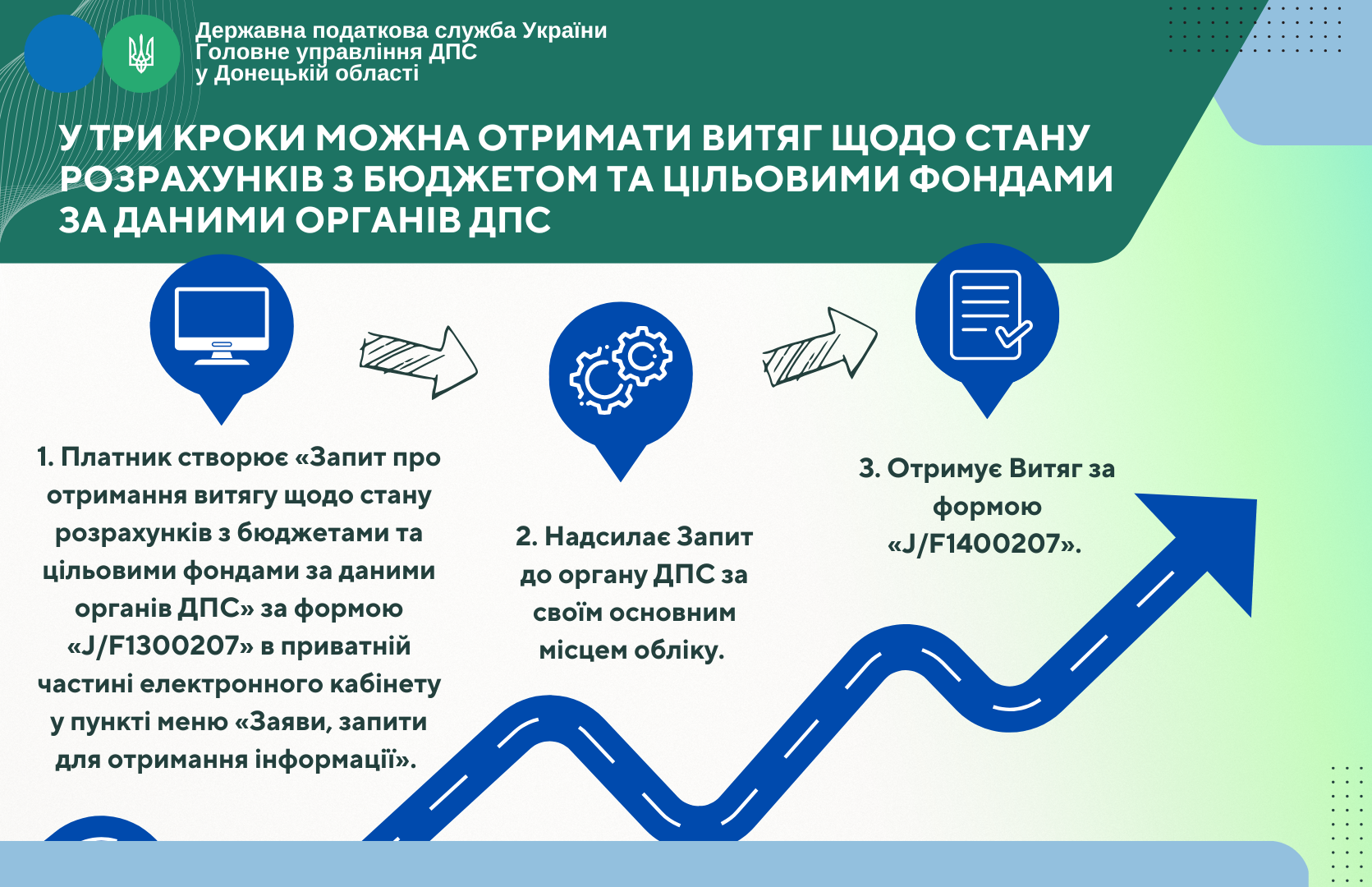 Шановні платники! Головне управління ДПС у Донецькій області нагадує. В електронному кабінеті удосконалено сервіс одержання платником документа, що підтверджує стан розрахунків з державним та місцевими бюджетами, а також цільовими фондами, який формується автоматизовано з накладанням кваліфікованого електронного підпису керівника економічного аналізу територіального органу ДПС (далі - Витяг щодо стану розрахунків).