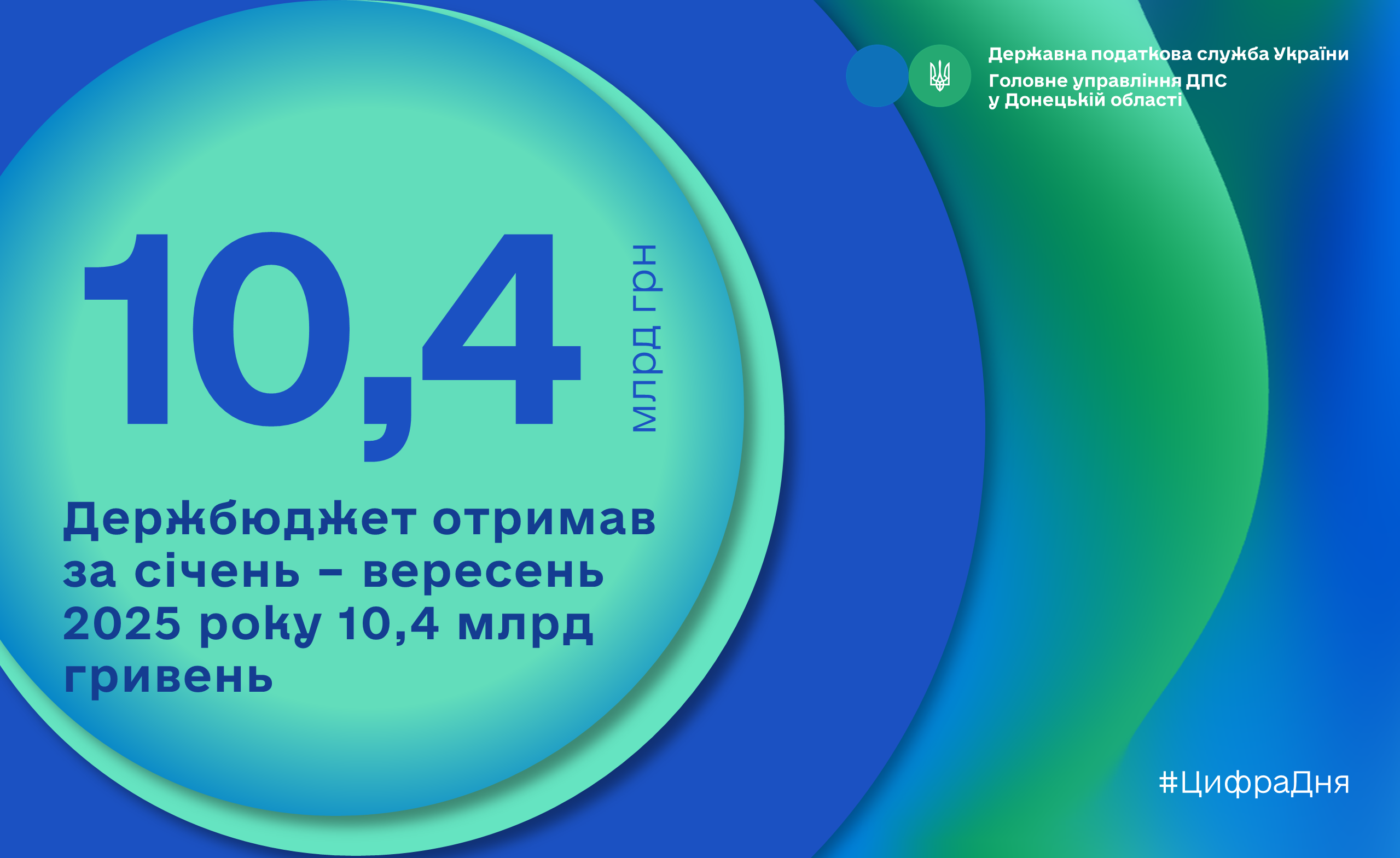 У січні - вересні 2025 року платниками податків Донецької області забезпечено перерахування до загального та спеціального фондів в розмірі 10,4 млрд гривень, що більше за показники попереднього року на 0,7 млрд гривень, або на 7,3%.
