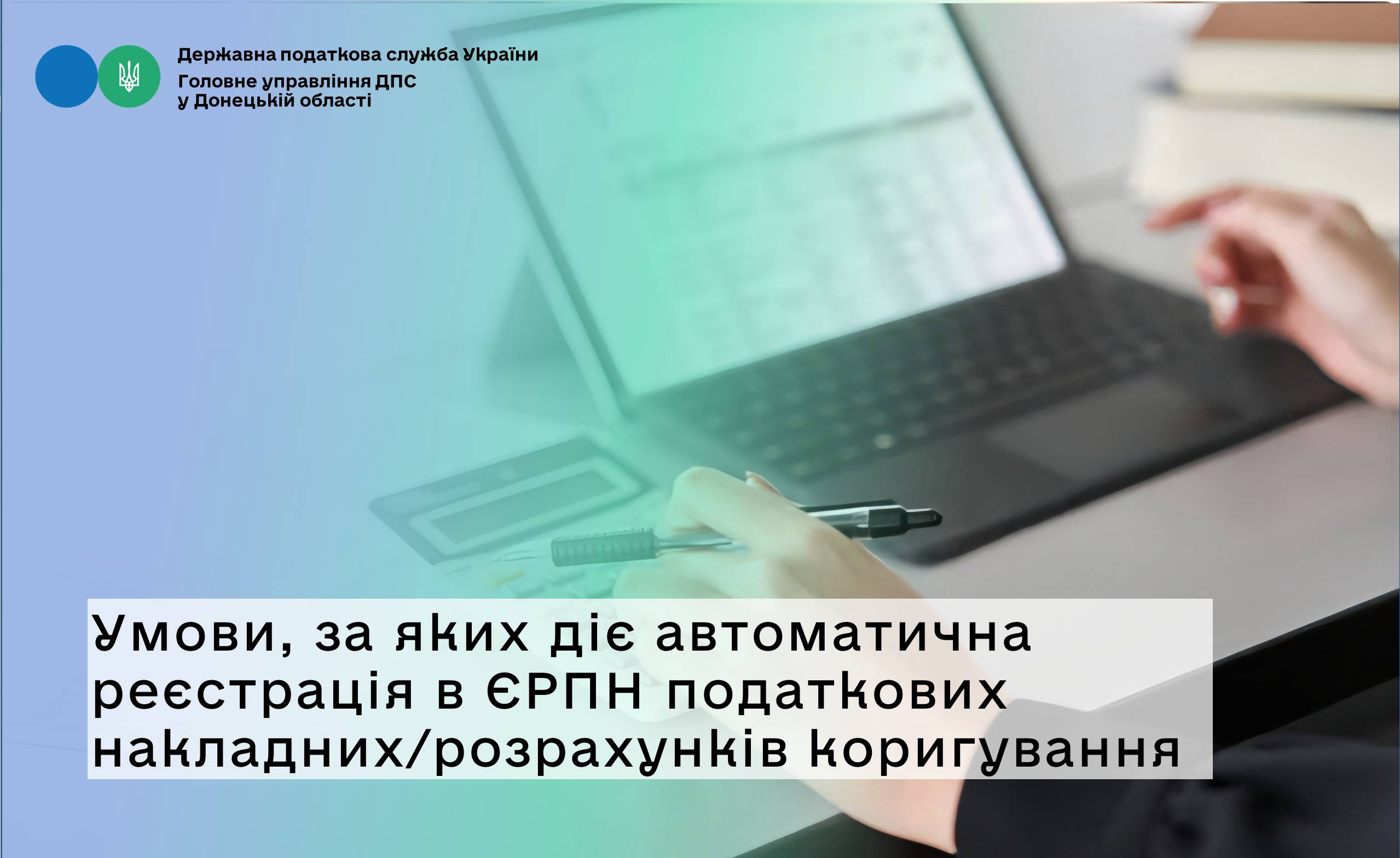 Шановні платники! Головне управління ДПС у Донецькій області нагадує, що пунктом 6 прим. 1 Порядку зупинення реєстрації податкової накладної/розрахунку коригування в Єдиному реєстрі податкових накладних, затвердженого постановою Кабінету Міністрів України від 11 грудня 2019 року № 1165 «Про затвердження порядків з питань зупинення реєстрації податкової накладної/розрахунку коригування в Єдиному реєстрі податкових накладних» (із змінами) (далі – Порядок зупинення) визначено, що у разі прийняття комісією регіонального рівня рішення про невідповідність платника податку на додану вартість (податок) критеріям ризиковості платника податку за результатами розгляду інформації та копій документів, поданих платником податку для підтвердження невідповідності критеріям ризиковості платника податку, або прийняття комісією центрального рівня рішення про задоволення скарги та скасування рішення комісії регіонального рівня про відповідність платника податку критеріям ризиковості платника податку, наступного робочого дня після дати прийняття такого рішення підлягають автоматичній реєстрації податкові накладні/розрахунки коригування (ПН/РК), якщо одночасно виконуються такі умови: