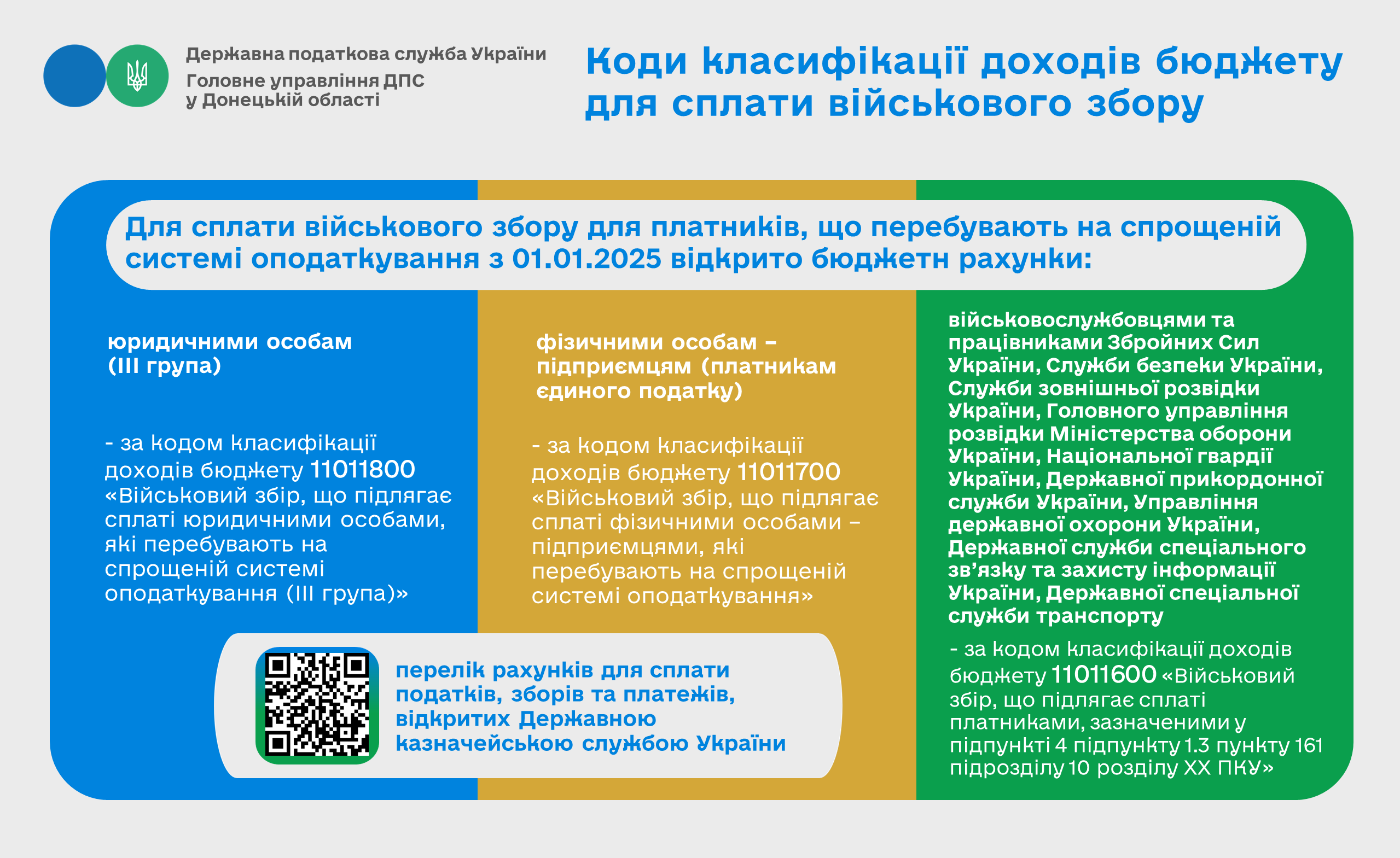 Для сплати військового збору для платників, що перебувають на спрощеній системі оподаткування з 01.01.2025 відкрито бюджетні рахунки: