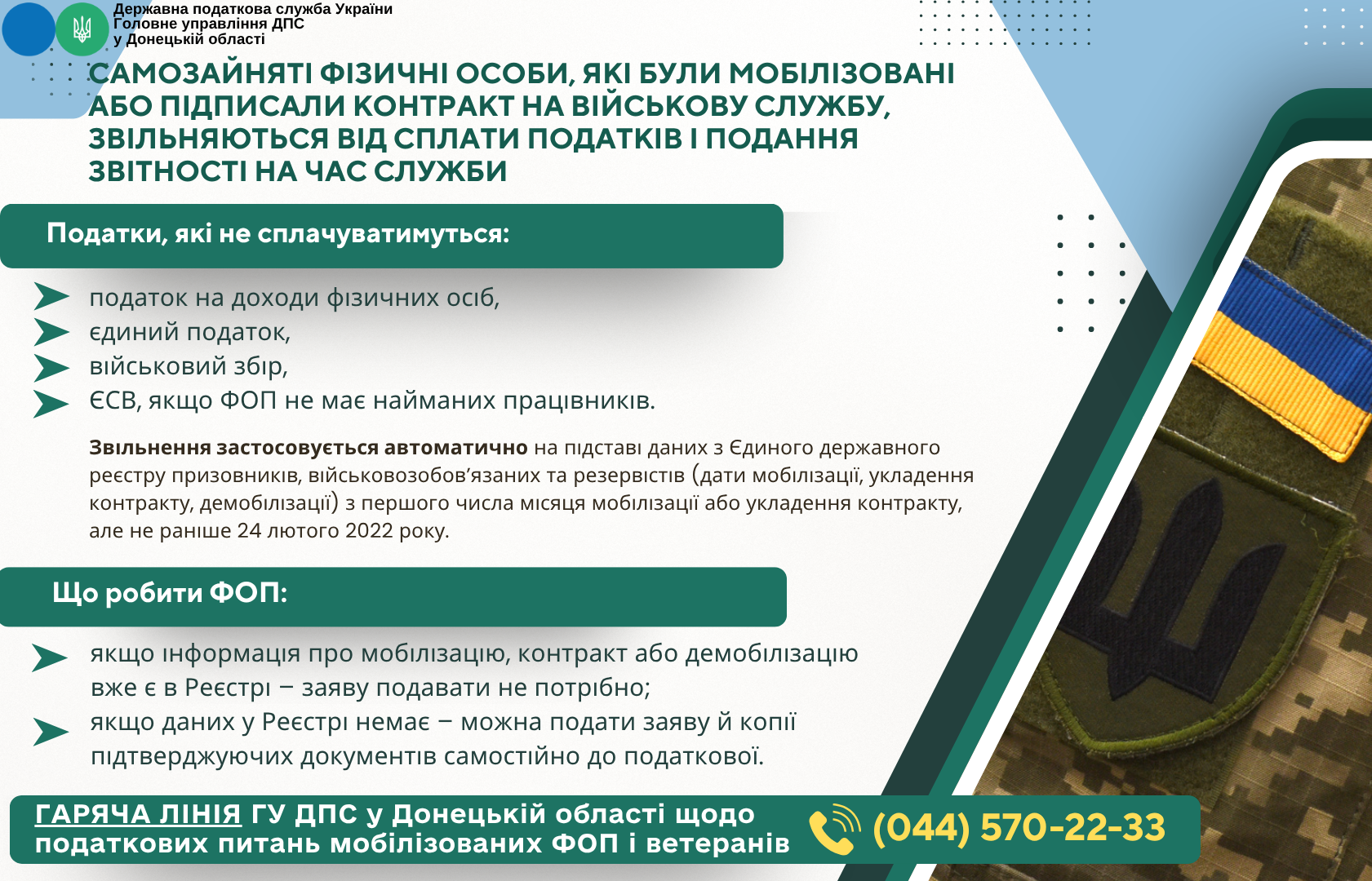 Шановні платники! Головне управління ДПС у Донецькій області інформує, що cамозайняті фізичні особи, які були мобілізовані або підписали контракт на військову службу, звільняються від сплати податків і подання звітності на час служби. Набрали чинності відповідні зміни до Податкового кодексу (Закон № 4505-ІХ).