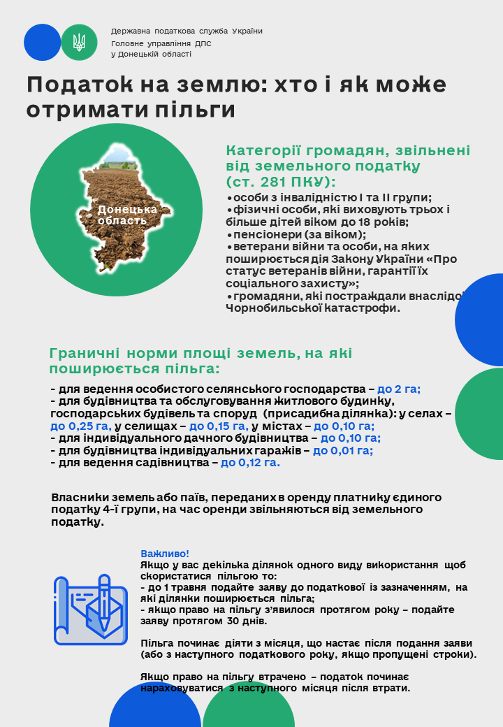 Шановні платники! Головне управління ДПС у Донецькій області нагадує, що окремі категорії громадян мають право на звільнення від сплати земельного податку або надання податкових пільг. Це передбачено Податковим кодексом України (ст. 281) та іншими нормативними актами.
