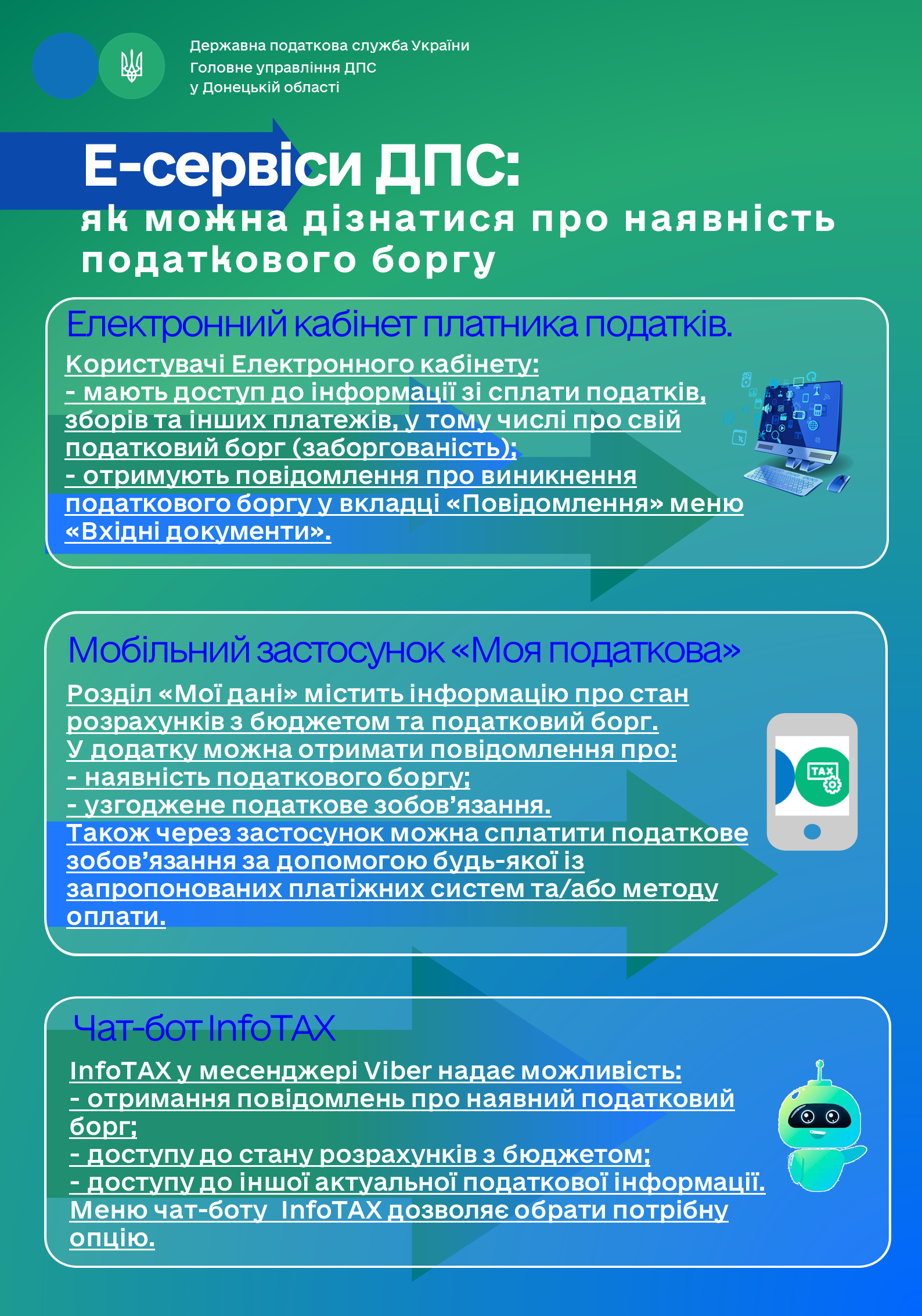Шановні платники! Головне управління ДПС у Донецькій області нагадує про зручні та доступні способи отримати інформацію про податковий борг через електронні сервіси ДПС.