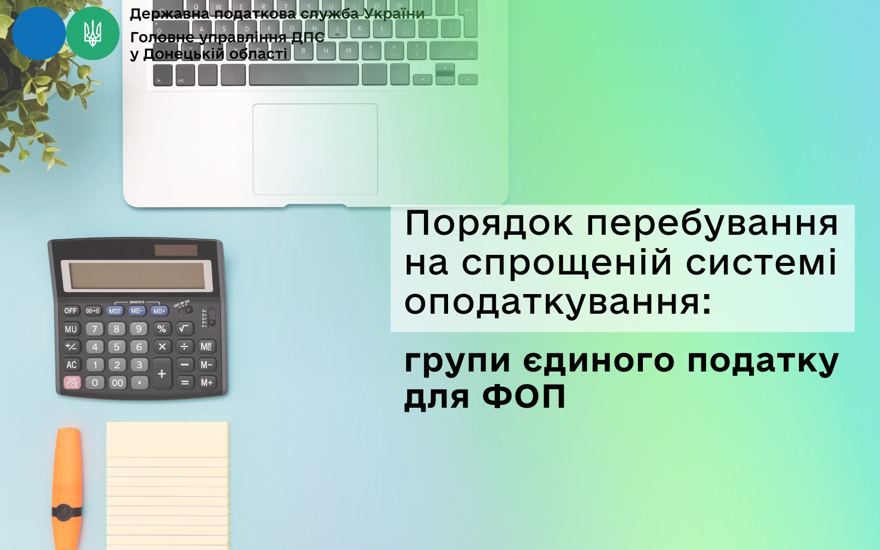 Шановні платники! Головне управління ДПС у Донецькій області нагадує фізичним особам - підприємцям, що порядок перебування на спрощеній системі визначено статтями 291 - 300 Податкового кодексу України. Фізичні особи – підприємці, які застосовують спрощену систему оподаткування, обліку та звітності, поділяються, зокрема, на такі групи платників єдиного податку: