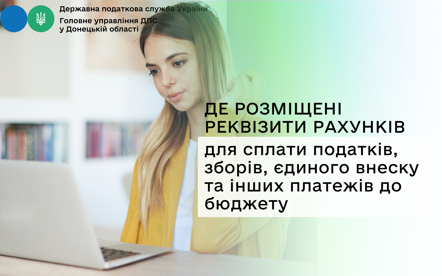 Шановні платники! Головне управління ДПС у Донецькій області нагадує, що своєчасне доведення платникам податків реквізитів рахунків для сплати податків, зборів та платежів, відкритих Державною казначейською службою України, відбувається шляхом їх розміщення в Центрах обслуговування платників податків, на офіційному вебпорталі відповідного територіального органу ДПС або на вебпорталі ДПС за посиланням: Головна/Рахунки для сплати платежів (https://tax.gov.ua/rahunki-dlya-splati-platejiv/).