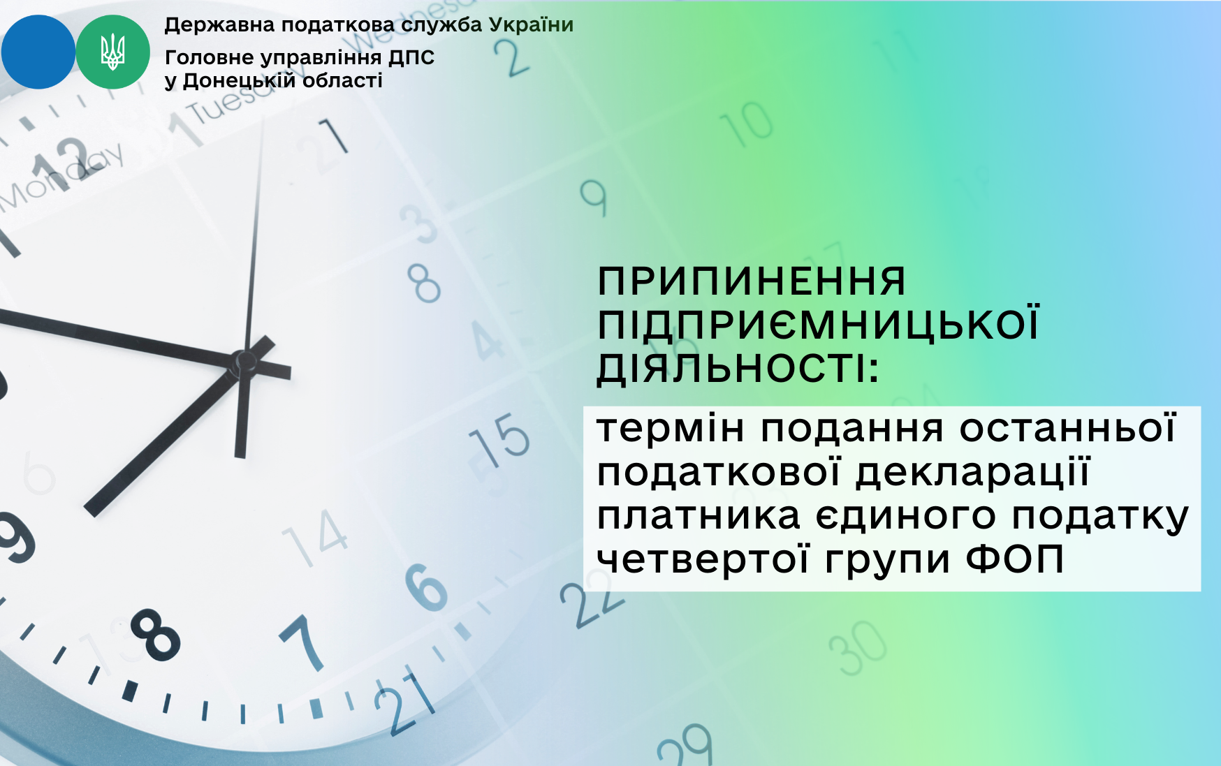 Шановні платники! Головне управління ДПС у Донецькій області інформує, що остання податкова декларація платника єдиного податку четвертої групи подається протягом поточного року, на який припадає дата державної реєстрації припинення підприємницької діяльності, або не пізніше 20 лютого наступного року. В рядку 1 загальної частини Декларації зазначаються дві відмітки одночасно «Загальна», «Звітна».