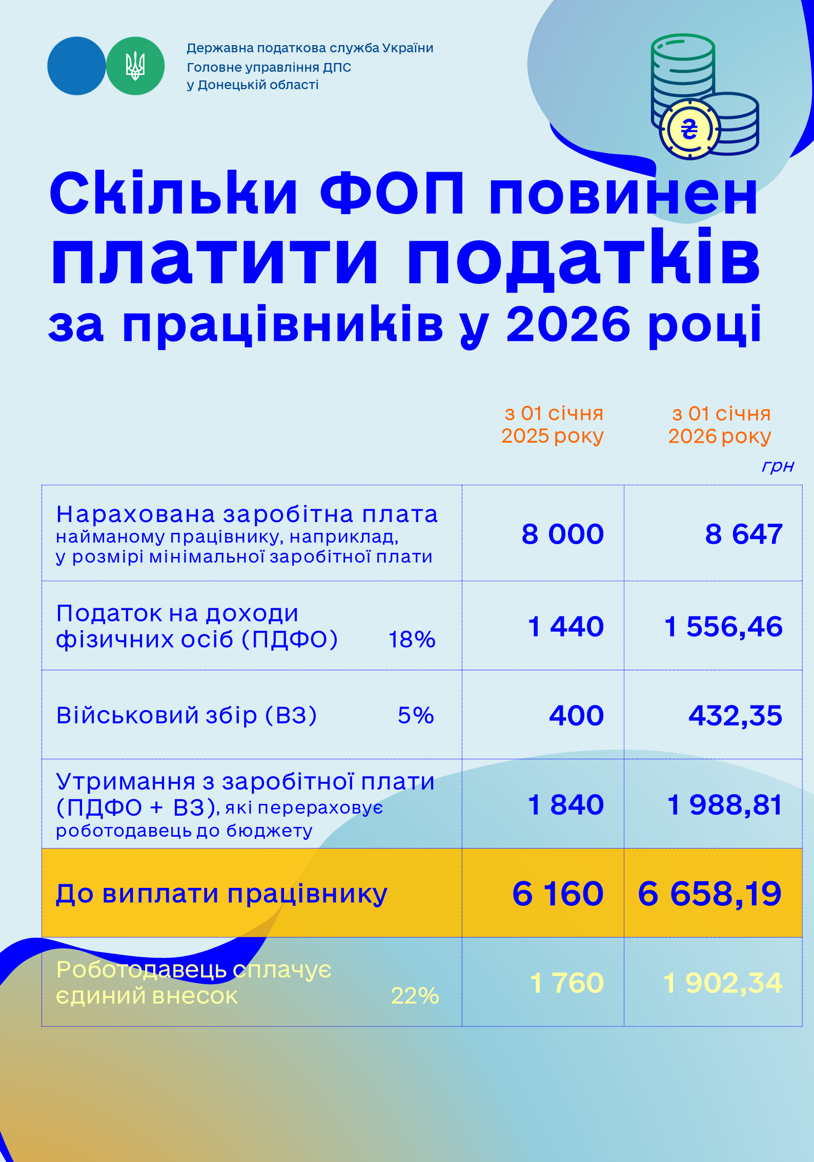 У 2026 році змінюється податкове навантаження у ФОПів у зв’язку зі збільшенням розміру заробітної плати. Нижче наведені суми податків, зборів та платежів, які доведеться сплачувати ФОПу на єдиному податку у 2026 році (на прикладі мінімальної зарплати)