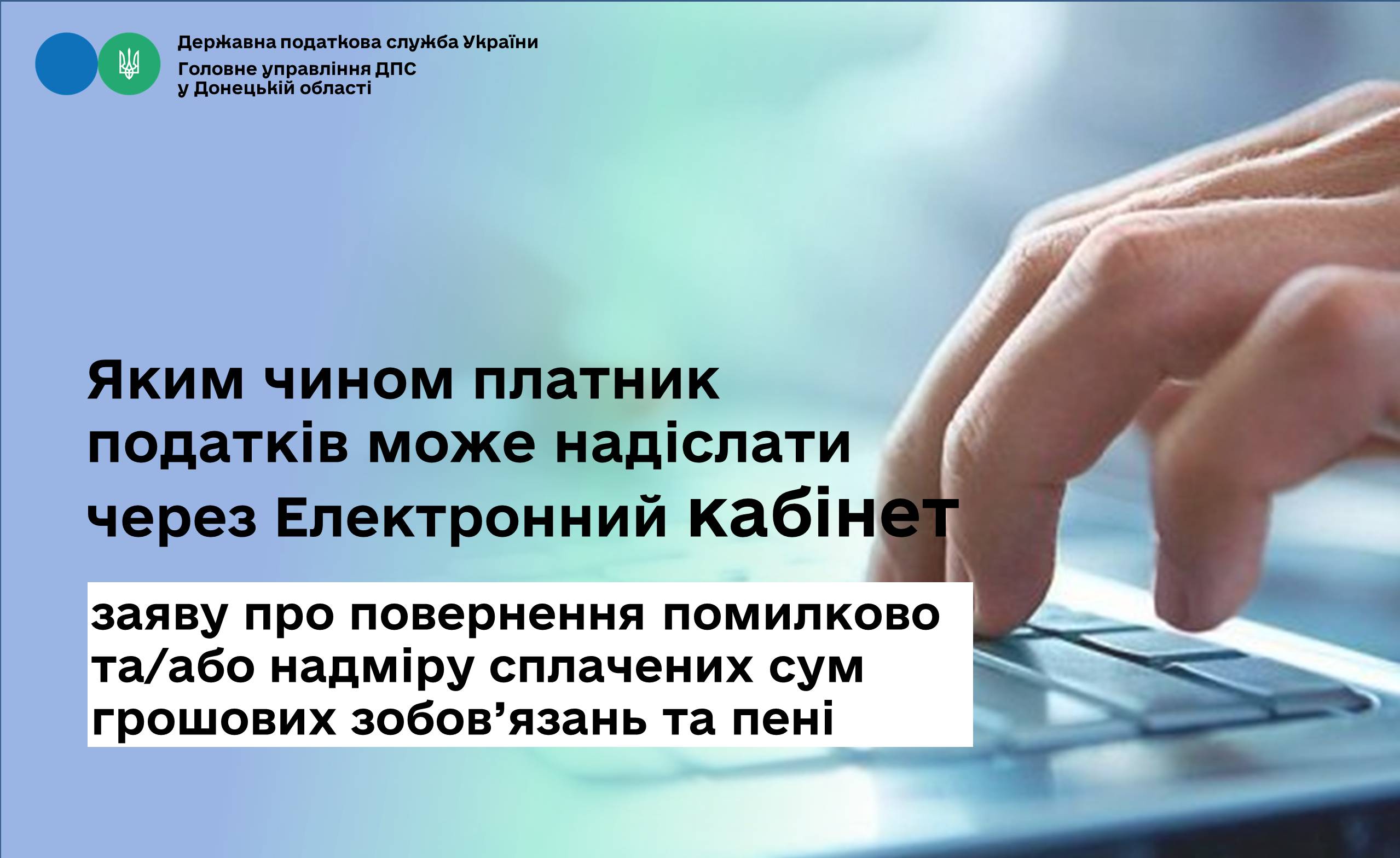 Головне управління ДПС у Донецькій області нагадує, що платник податків може надіслати заяву про повернення помилково та/або надміру сплачених сум грошових зобов’язань та пені (далі – Заява) в режимі «Введення звітності» приватної частини Електронного кабінету за формою J/F1302002