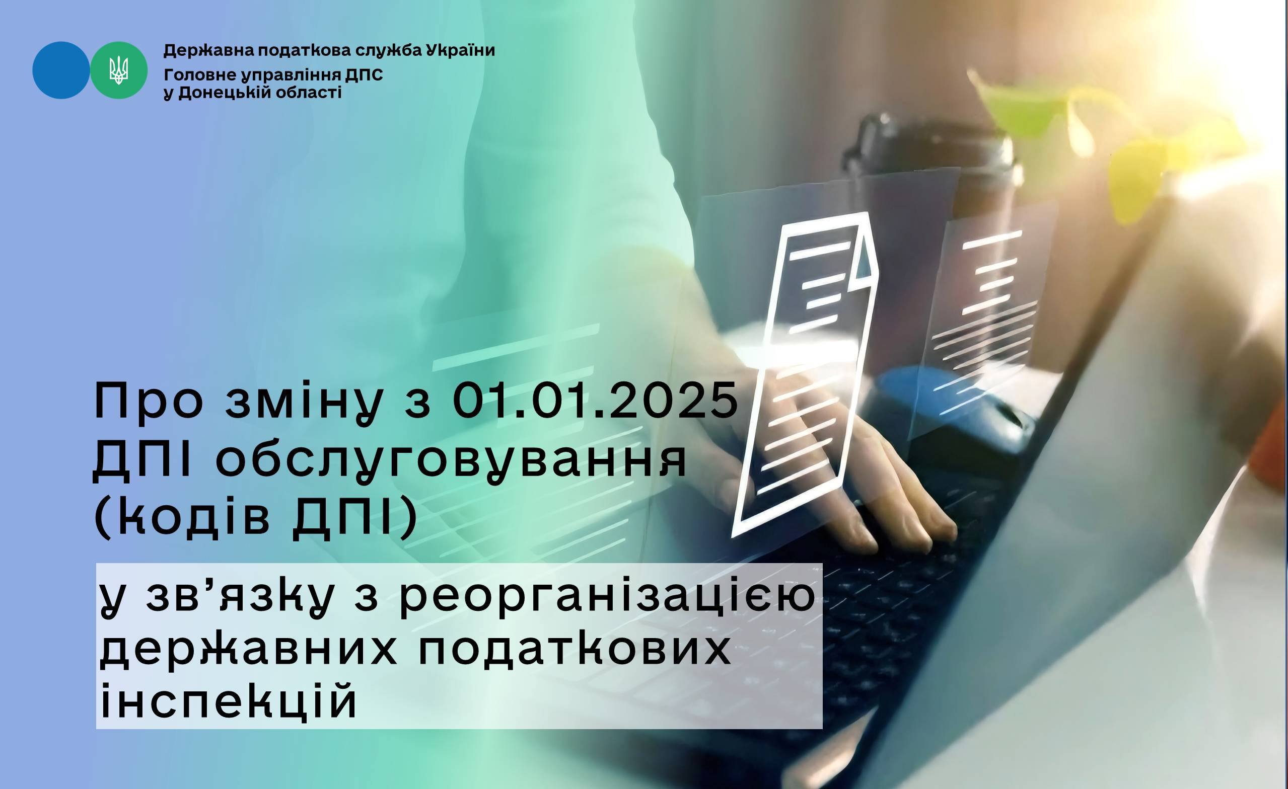 Головне управління ДПС у Донецькій області інформує про зміну з 01.01.2025 ДПІ обслуговування (кодів ДПІ) згідно з наказом Головного управління ДПС у Донецькій області від 30.12.2024 № 441 «Про затвердження переліку платників податків та зміну ДПІ обслуговування» у зв’язку з реорганізацією державних податкових інспекцій.
