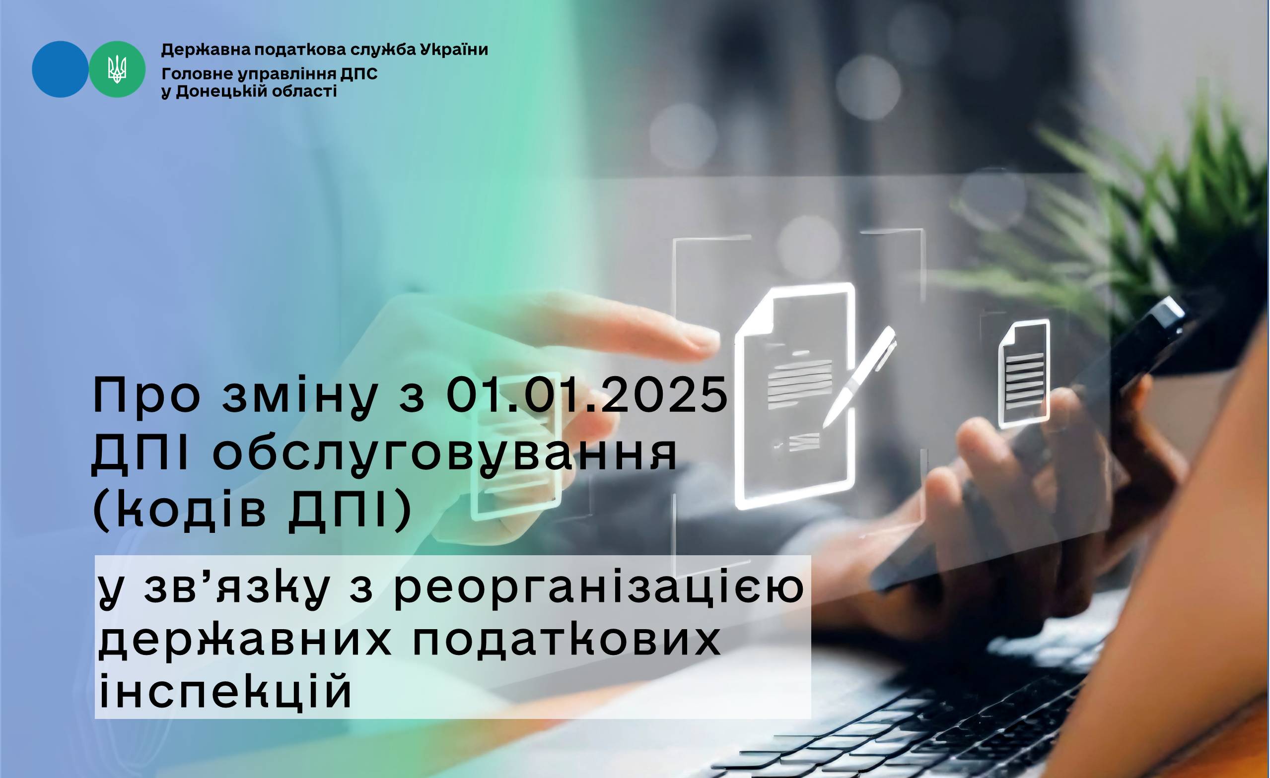 Головне управління ДПС у Донецькій області інформує про зміну з 01.01.2025 ДПІ обслуговування (кодів ДПІ) згідно з наказом Головного управління ДПС у Донецькій області від 30.12.2024 № 441 «Про затвердження переліку платників податків та зміну ДПІ обслуговування» у зв’язку з реорганізацією державних податкових інспекцій.