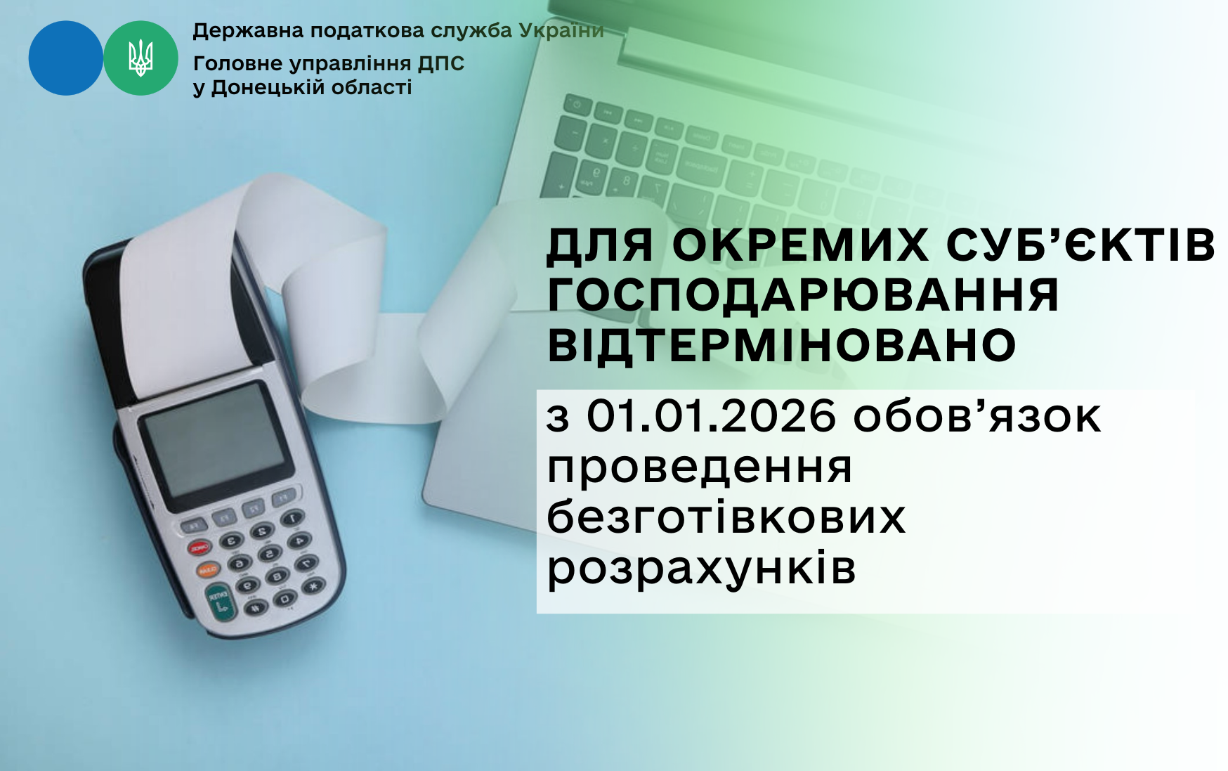 Головне управління ДПС у Донецькій області інформує, що Постановою Кабінету Міністрів України від 29 грудня 2025 року № 1768 (далі – Постанова № 1768) внесено зміни до п. 1 постанови Кабінету Міністрів України від 29 липня 2022 року № 894 «Про встановлення строків, до настання яких торговці повинні забезпечити можливість здійснення безготівкових розрахунків (у тому числі з використанням електронних платіжних засобів, платіжних застосунків або платіжних пристроїв) за продані ними товари (надані послуги)» (далі – Постанова № 894), замінивши у п.п. 4 слова і цифри «з 1 січня 2026 р.» словами «через три місяці з дня припинення чи скасування воєнного стану».