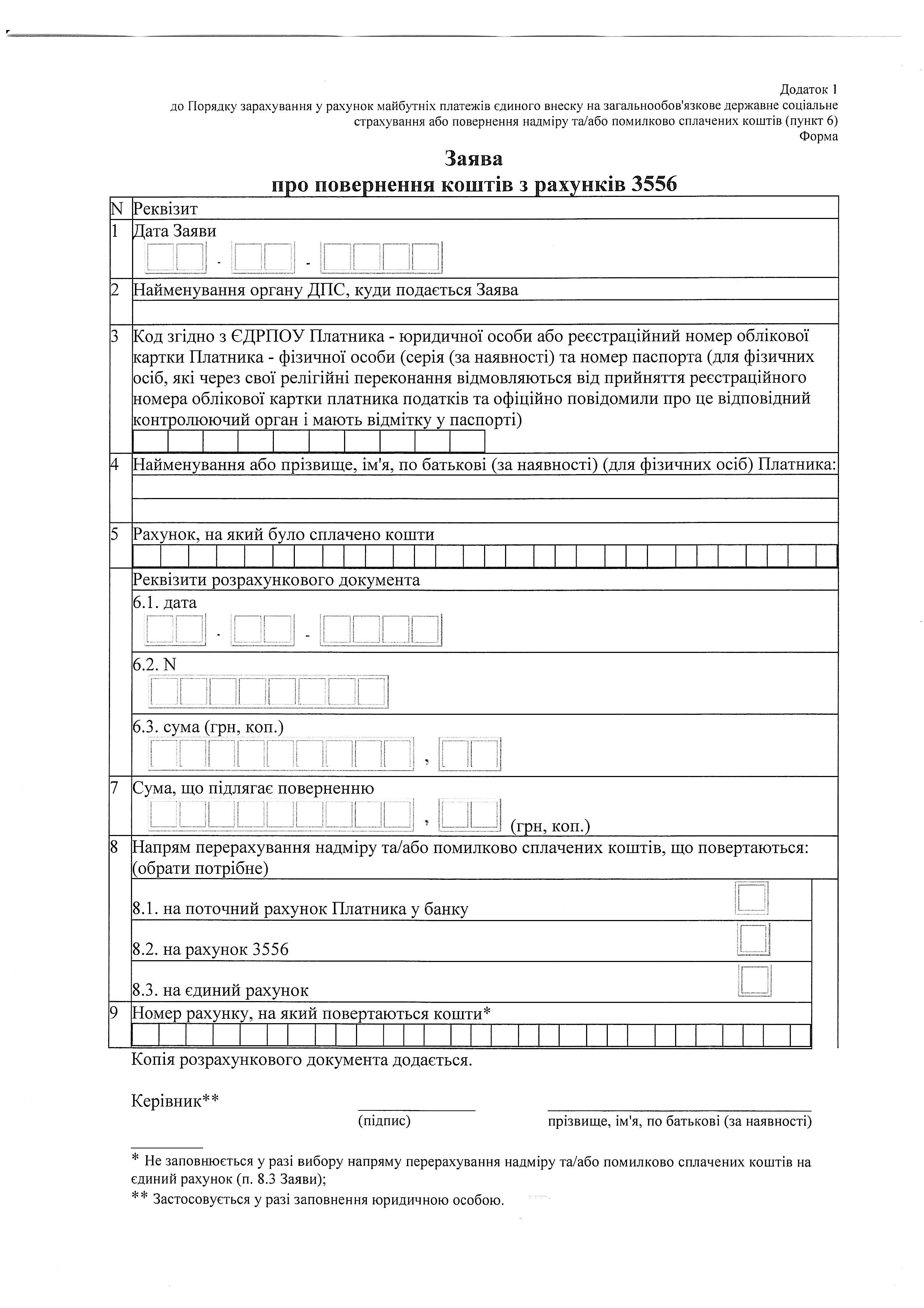 Повернення сум ЄСВ здійснюється на підставі заяви платника про таке повернення. Заява про повернення коштів з рахунків 3556 подається до територіального органу ДПС за місцем обліку надміру та/або помилково сплачених коштів, за формою, визначеною в додатку 1 до Порядку № 417.