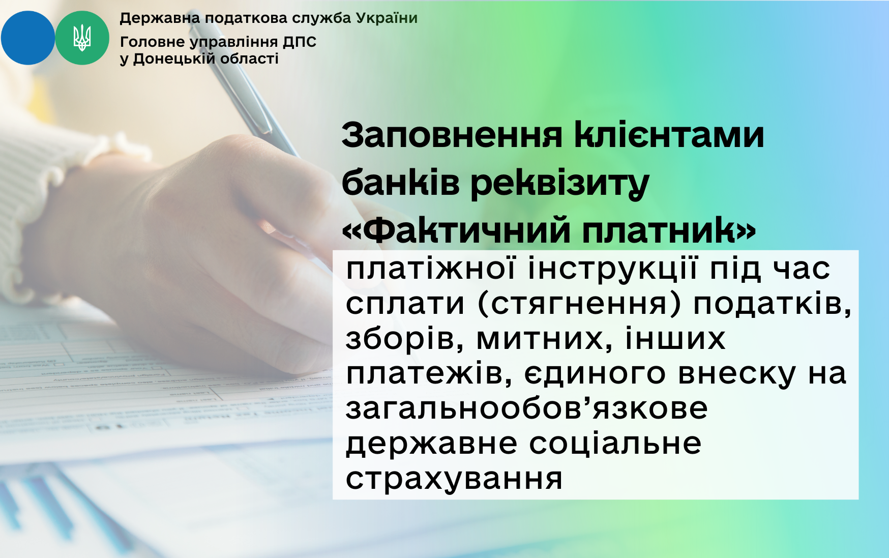 Головне управління ДПС у Донецькій області нагадує, що реквізит «Фактичний платник» заповнюється у випадках коли платник ініціює платіжну операцію за фактичного платника (тобто за іншу особу). В інших випадках реквізит «Фактичний платник» платником не заповнюється. Це передбачено Інструкцією про безготівкові розрахунки в національній валюті користувачів платіжних послуг, затвердженою постановою Правління Національного банку України від 29.07.2022 № 163 «Про затвердження Інструкції про безготівкові розрахунки в національній валюті користувачів платіжних послуг».