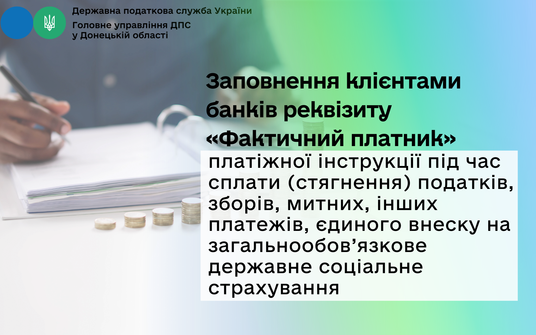 Головне управління ДПС у Донецькій області нагадує, що реквізит «Фактичний платник» заповнюється у випадках коли платник ініціює платіжну операцію за фактичного платника (тобто за іншу особу). В інших випадках реквізит «Фактичний платник» платником не заповнюється. Це передбачено Інструкцією про безготівкові розрахунки в національній валюті користувачів платіжних послуг, затвердженою постановою Правління Національного банку України від 29.07.2022 № 163 «Про затвердження Інструкції про безготівкові розрахунки в національній валюті користувачів платіжних послуг».