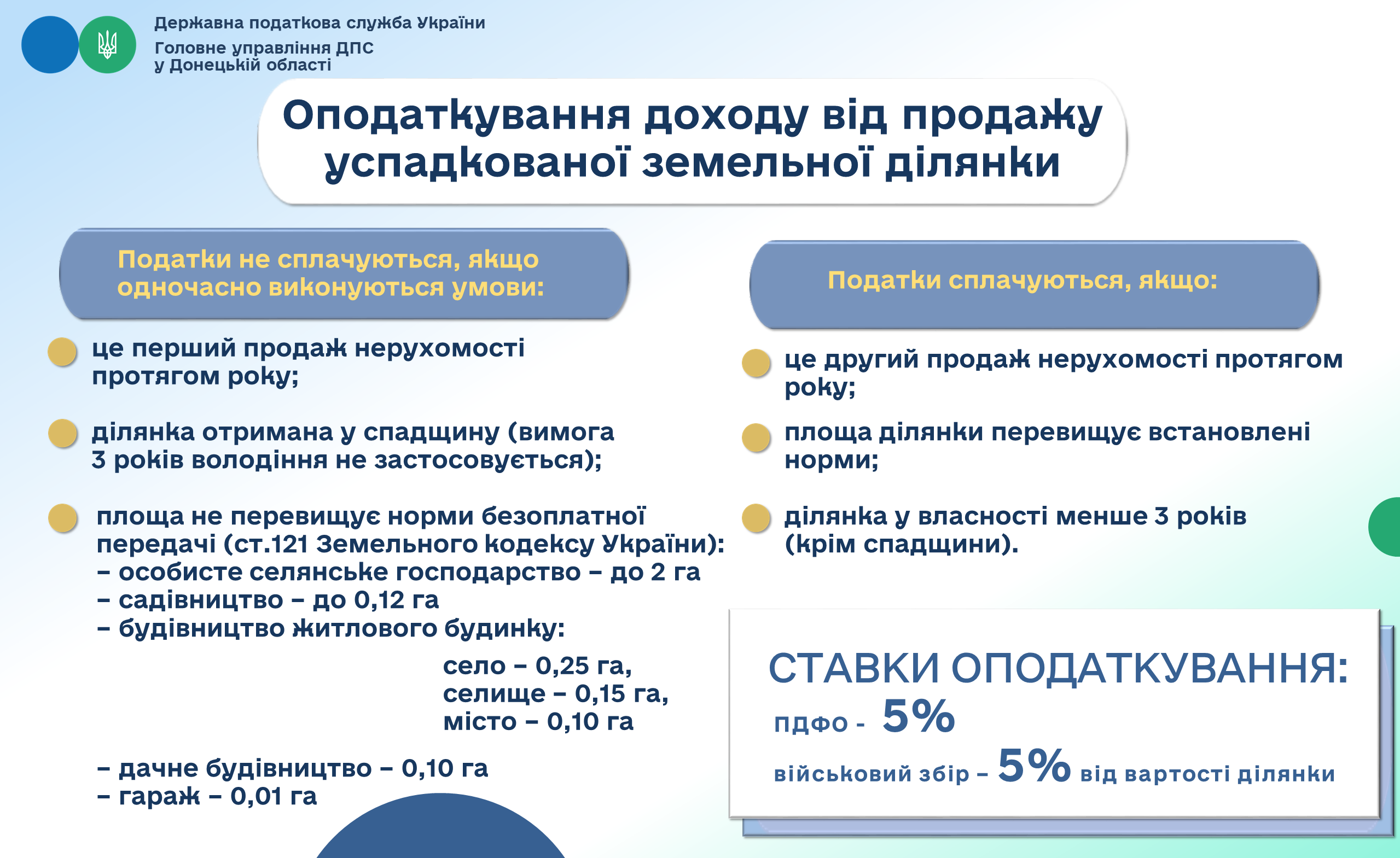 У цих випадках дохід від продажу земельної ділянки, яка набута у спадщину, оподатковується ПДФО та військовим збором за однаковою ставкою 5% від вартості.