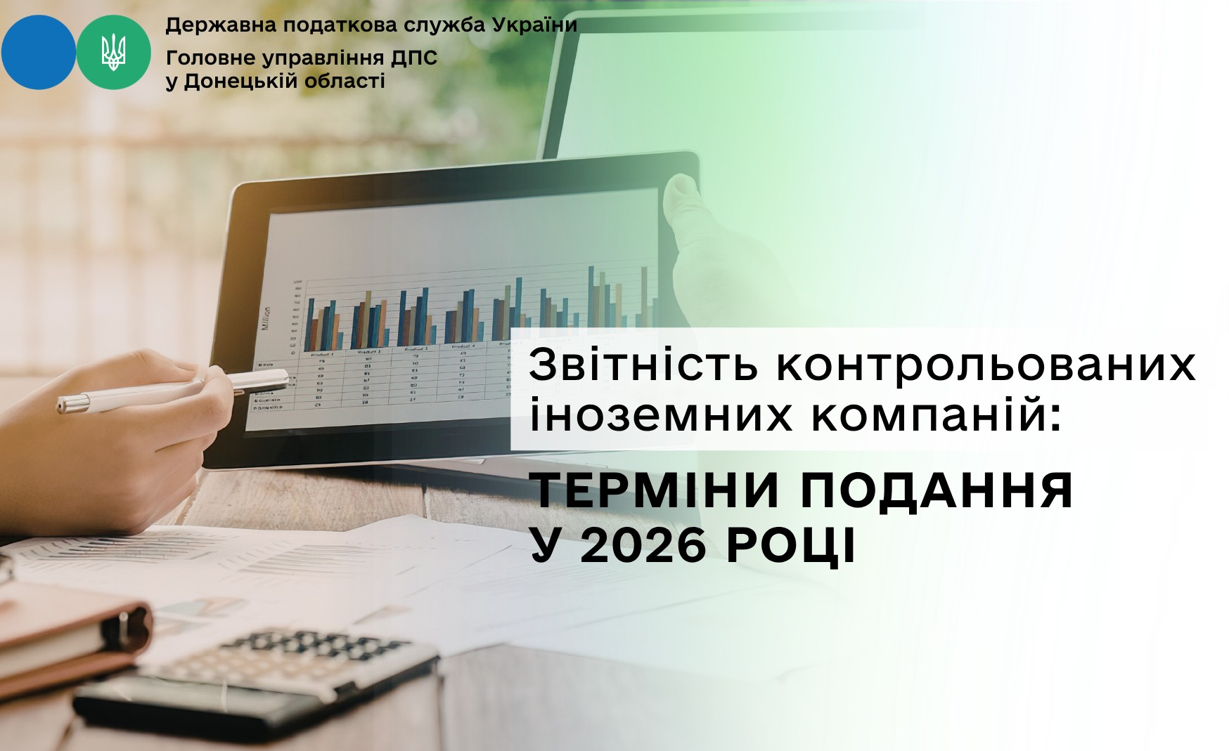 Шановні платники! Головне управління ДПС у Донецькій області нагадує, що у 2026 році контролюючі особи контрольованих іноземних компаній (КІК) повинні подати звітність за 2025 звітний рік у чітко визначені строки: до 2березня – юридичні особи, до 1 травня – фізичні особи.