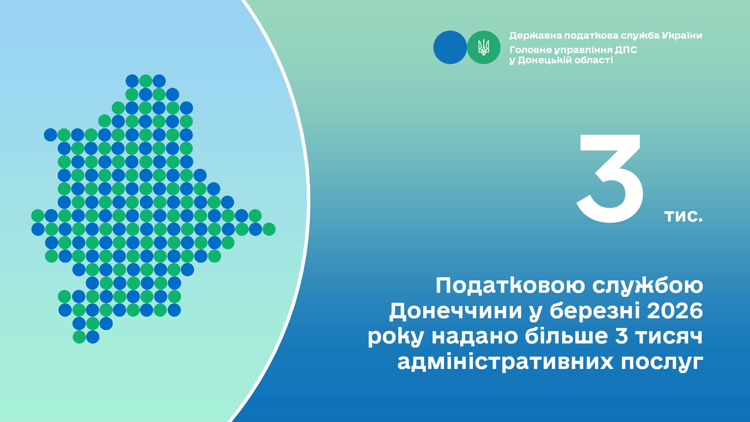 У березні 2026 року до податкових органів Донеччини надійшло 3 297 звернень платників податків за отриманням адміністративних послуг. Суб'єктам звернень надано 3 080 адміністративних послуг, з них в електронному вигляді – 1 595 послуг, що становить 51,8% від наданих послуг. Відмовлено у наданні адміністративних послуг 146 заявникам у зв'язку з невиконанням відповідних умов для їх отримання.