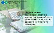 Шановні платники! Головне управління ДПС у Донецькій області нагадує, що відповідно до п. 137.12 ст. 137 Податкового кодексу України платники податку на прибуток підприємств, які здійснюють роздрібну торгівлю пальним, зобов’язані сплачувати авансові внески з податку на прибуток підприємств за кожне місце роздрібної торгівлі пальним, інформація щодо якого внесена до Єдиного реєстру ліцензіатів та місць обігу пального станом на перше число поточного місяця.