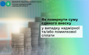 У випадку помилкової сплати сум єдиного внеску повернення коштів здійснюється відповідно до Порядку зарахування у рахунок майбутніх платежів єдиного внеску на загальнообов’язкове державне соціальне страхування або повернення надміру та/або помилково сплачених коштів, затвердженого наказом Міністерства фінансів України від 23.07.2021 № 417, зареєстрованого в Міністерстві юстиції України 09 вересня 2021 р. за № 1185/36807 (далі - Порядок № 417).