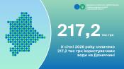 До бюджетів всіх рівнів Донецької області платники рентної плати за спеціальне використання води у січні 2026 року перерахували 217,2 тис гривень. Ця сума майже рівними частинами розподілена між державним та місцевими бюджетами: