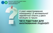 Відповідно до пункту 49 частини другої статті 46 Закону № 3817 підставою для прийняття органом ліцензування рішення про припинення дії ліцензії на право провадження відповідного виду господарської діяльності є факт невідповідності розміру середньої щомісячної заробітної плати, нарахованої суб’єктом господарювання, розміру, визначеному частиною тринадцятою статті 42 Закону № 3817, протягом трьох повних календарних місяців поспіль у період дії ліцензії, встановлений контролюючим органом під час проведення перевірки з питань дотримання вимог Закону № 3817 та зафіксований в акті такої перевірки.